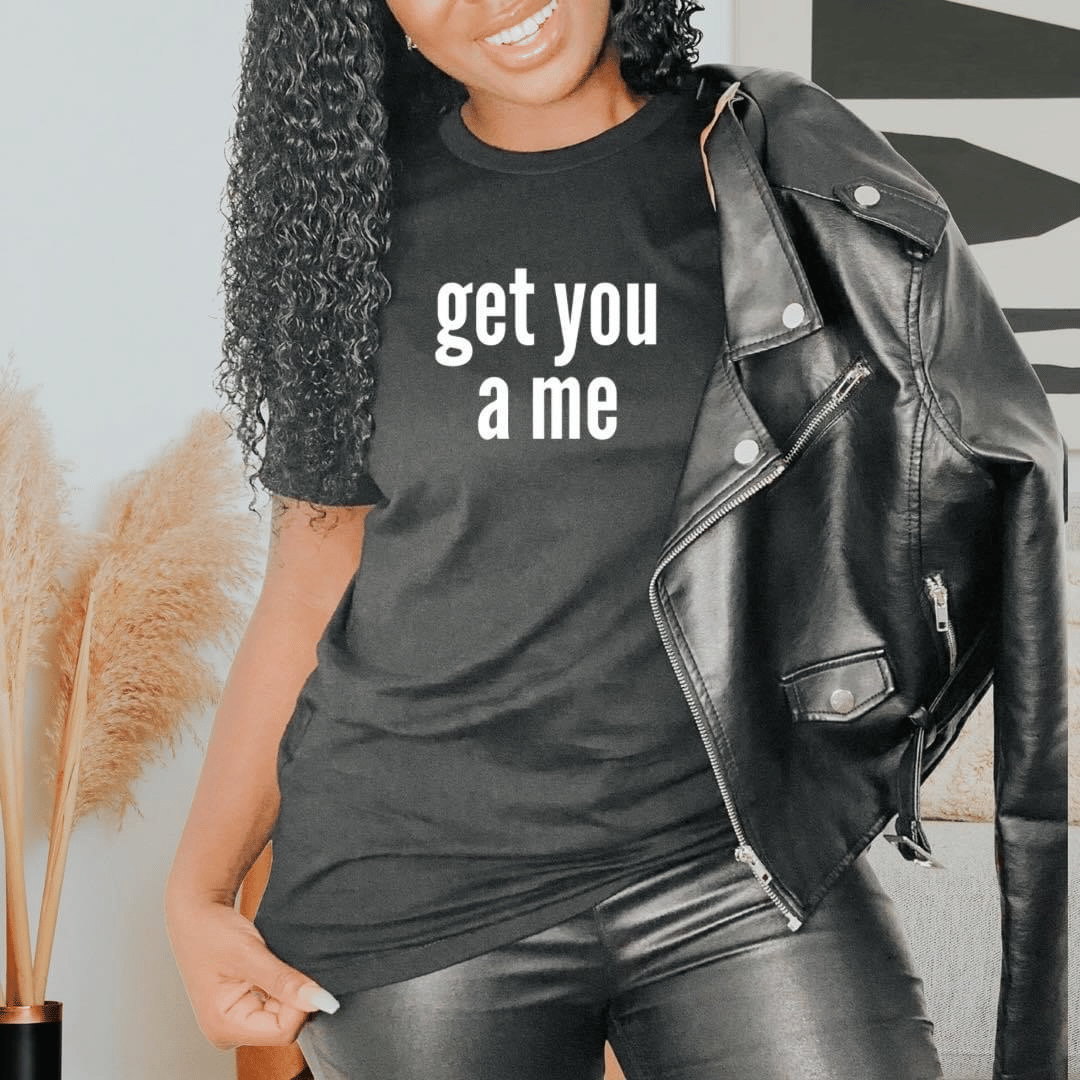 Get inspired by its bold message, and let it be a reminder of your strength, creativity, and talent. Stand out from the crowd with "Get you a Me" T-Shirt –the ultimate way to show the world who you are!